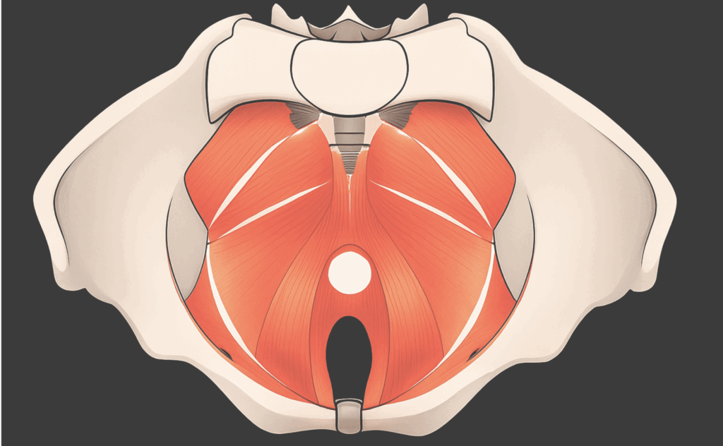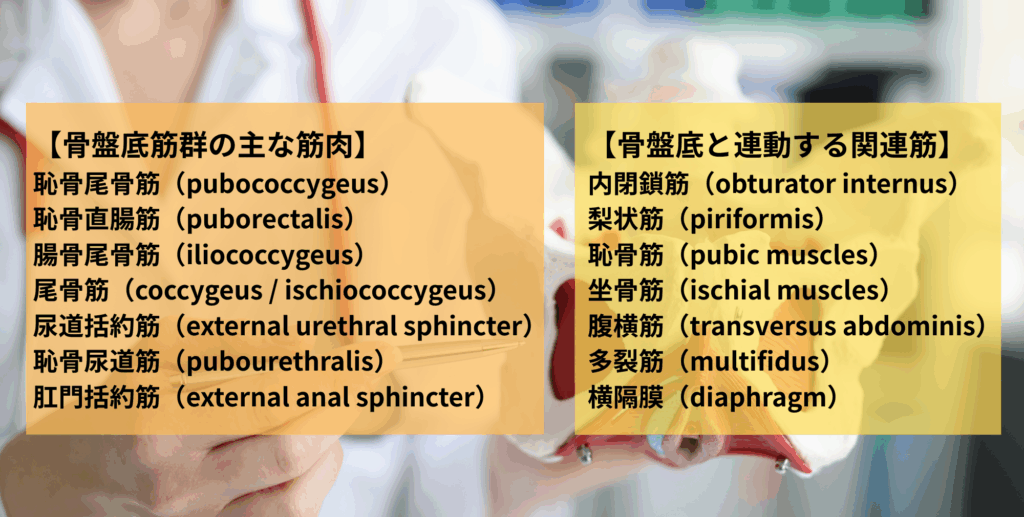 骨盤底筋群とは、骨盤の底に位置し、膀胱・子宮・直腸などの内臓を下から支える筋肉の集まりです。