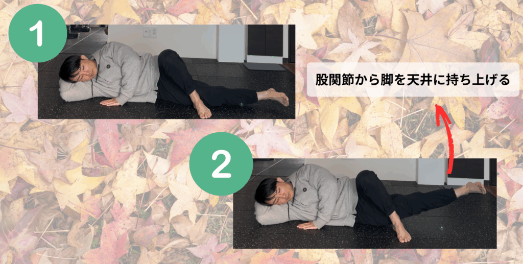 - 上側の足は伸ばしたまま天井方向へゆっくり上げる