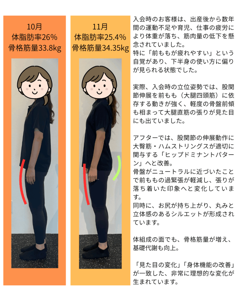 姿勢が整うと、見た目が美しくなるだけでなく、肩こり・腰痛の軽減、呼吸のしやすさ、動きの安定性向上にもつながります。