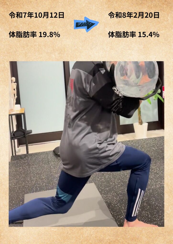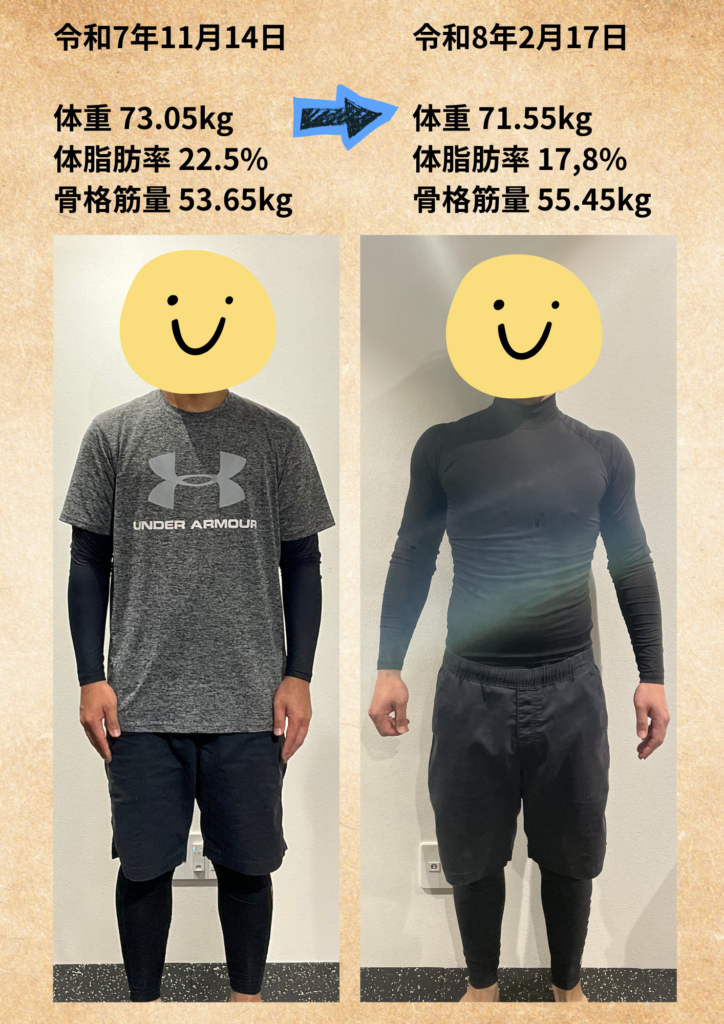 朝食も取り入れながら、「食べても正しく整えれば身体は変わる」という成功体験を得られました。無理な食事制限ではなく、適切なトレーニングと習慣改善を積み重ねた結果です。