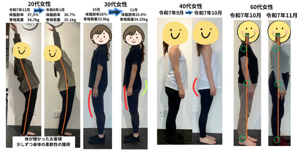 当ジムでは、ただ体重を落とすだけでなく「生涯健康的に動ける身体づくり」をコンセプトに、20代〜70代まで幅広い方のサポートを行っています。